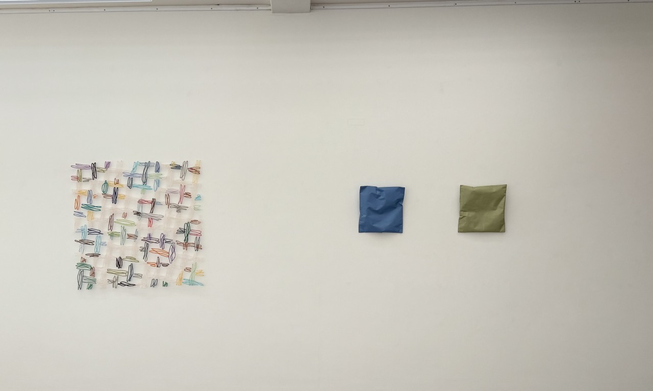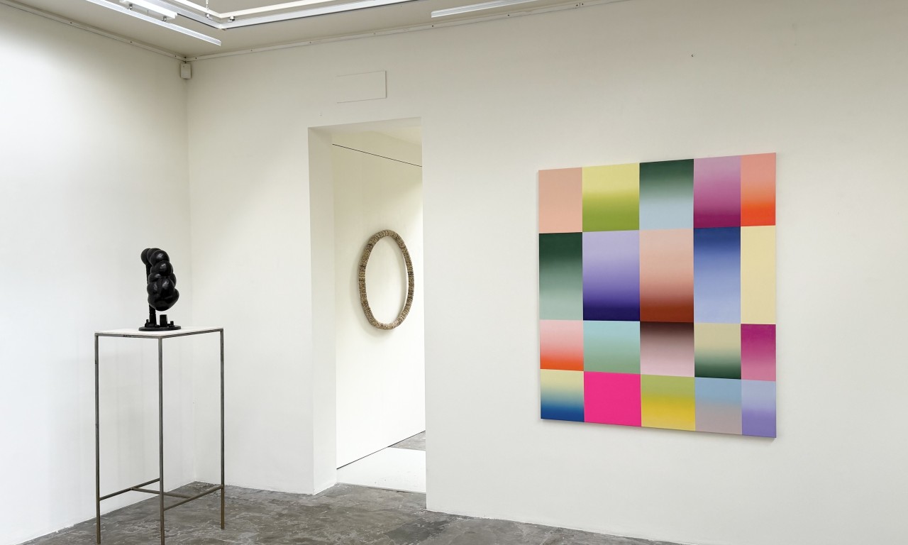 ‘Notities’ noemt ze de kleine werken. In haar atelier hangen er 59 in een rechthoekige formatie boven en naast elkaar. Het is een bron, een voorschot op wat komen gaat. Elk schilderijtje kan de aanleiding zijn voor een nieuwe serie abstracte doeken. Kán. ‘Want als ik er niets in zie, span ik ze af.’