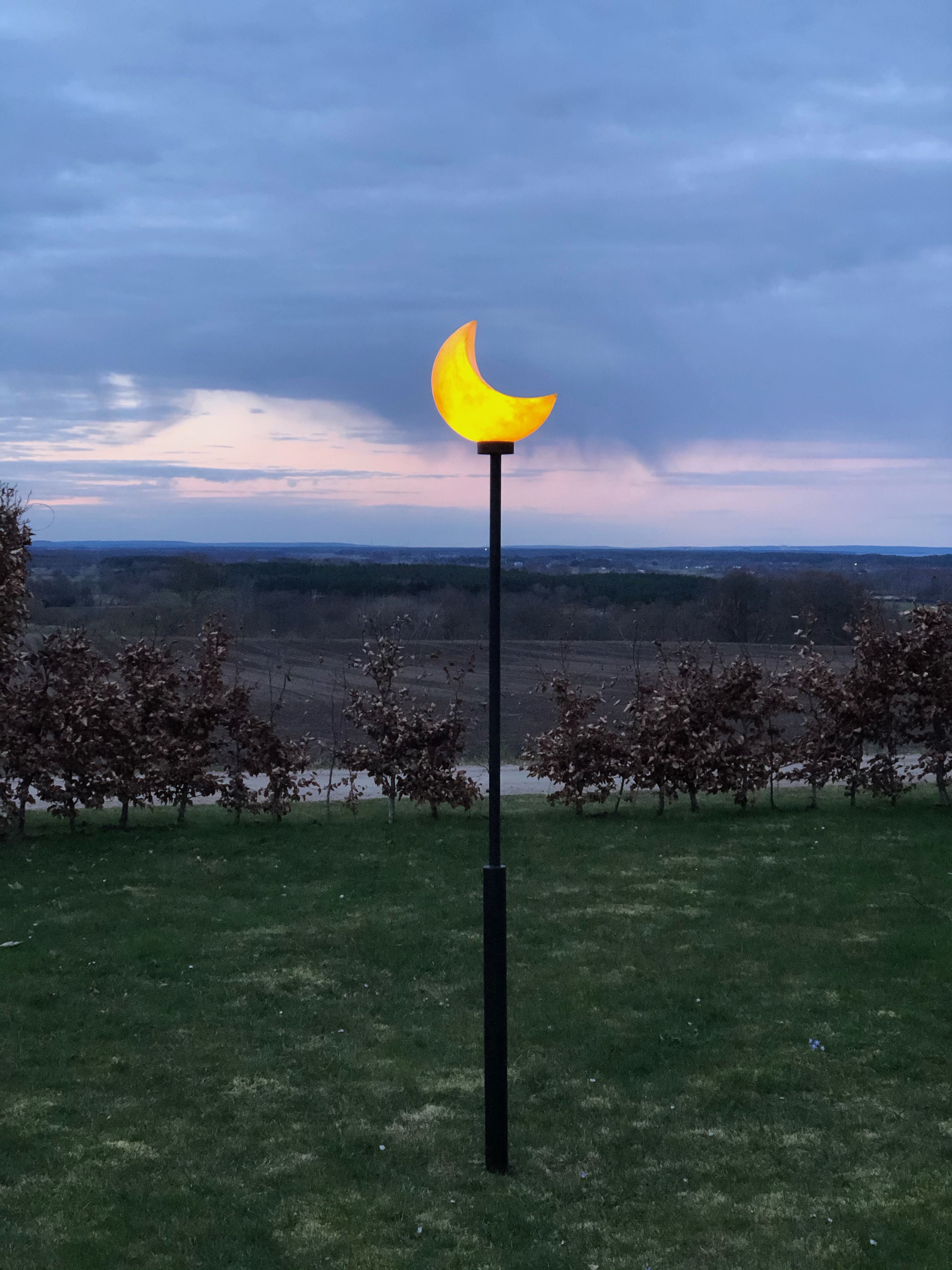 The work is a sculpture in the shape of a lamppost. The round shade is partly concave and changes with the movement of the spectator. From a certain angle the silhouette of a halv moon appears - that during the dark hours colors the surrounding with it's moonlight.