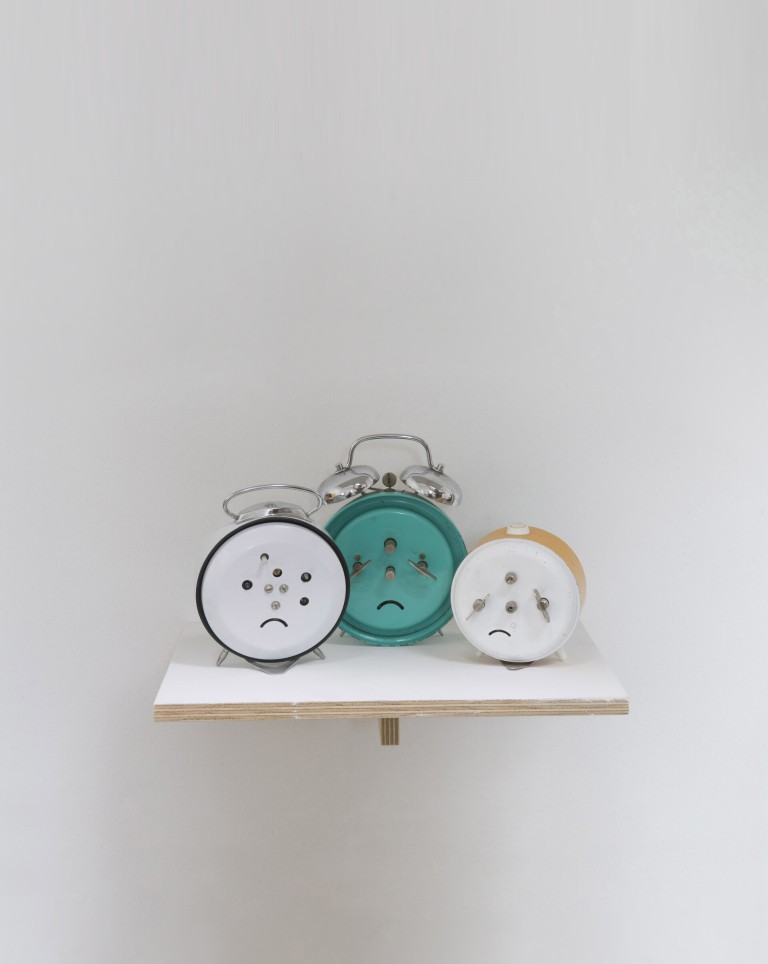 Die grenszone tussen herinnering en feitelijke waarneming is het domein van Halmans. Een schemergebied tussen waken en slapen, mijmeren en wegdromen. De alledaagse voorwerpen - tafels, stoelen, bedden, lampen en wekkers - die hij vindt, zelf maakt of op rommelmarkten koopt, plaatst hij in een context die ze een andere betekenis geeft. Door een spel te spelen met objecten worden spullen in Halmans' wereld getransformeerd tot persoonlijke herinneringsbeelden. Herinneringen zijn dan ook van essentieel belang voor de kunstenaar. 'Vergeten is alarmerend', zegt hij daarover, 'alles is tevergeefs geweest, zinloos, als je met vergeten tevreden zou zijn'. Halmans' werk verdient vaak wat extra aandacht, omdat je als kijker dan pas verrast wordt. Zo ook bij 'Sad machines', een werk dat op het eerste gezicht drie gewone wekkers toont. Wie beter kijkt, ziet echter dat de wekkers omgedraaid werden: een eenvoudige ingreep van Halmans die door de veranderde positie de objecten een heel andere betekenis verleent. Een ijzersterk beeld dat eigenlijk met minimale middelen wordt bereikt'.
