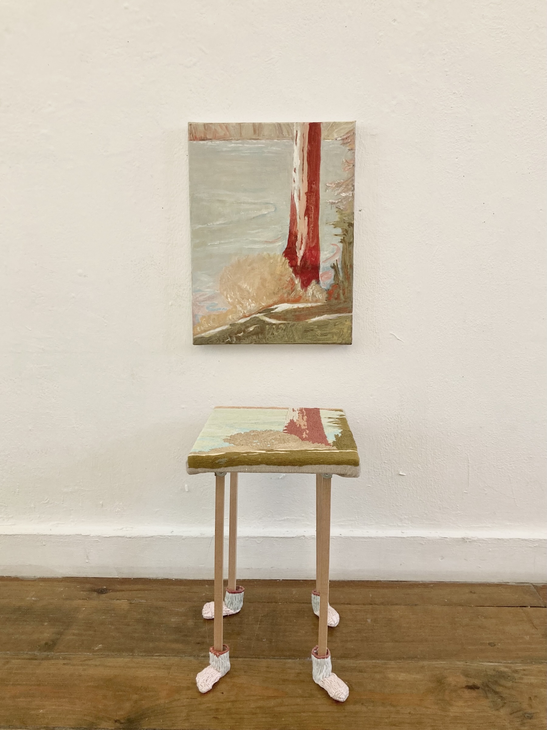 acrylic paint on canvas, embroidery on canvas wood