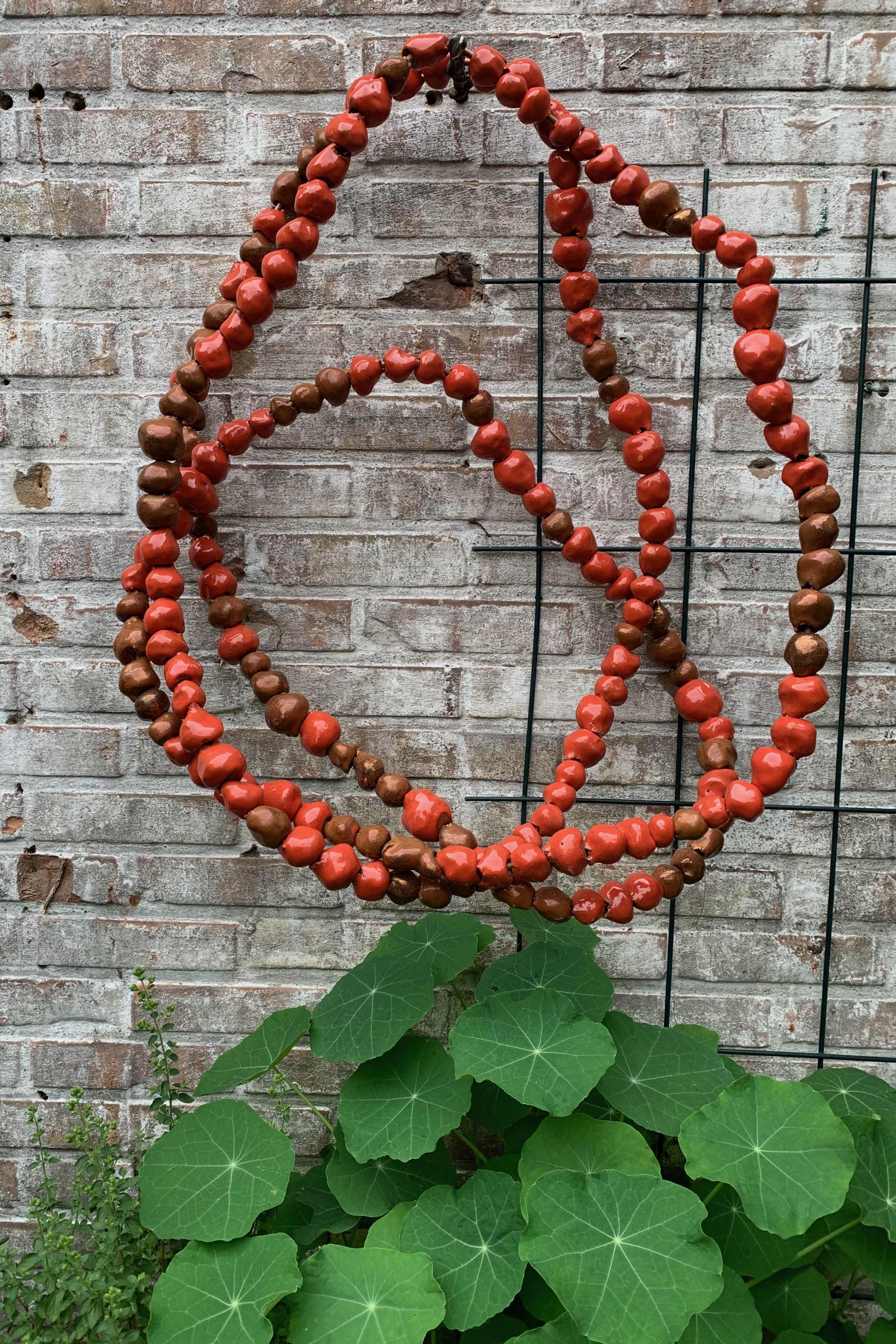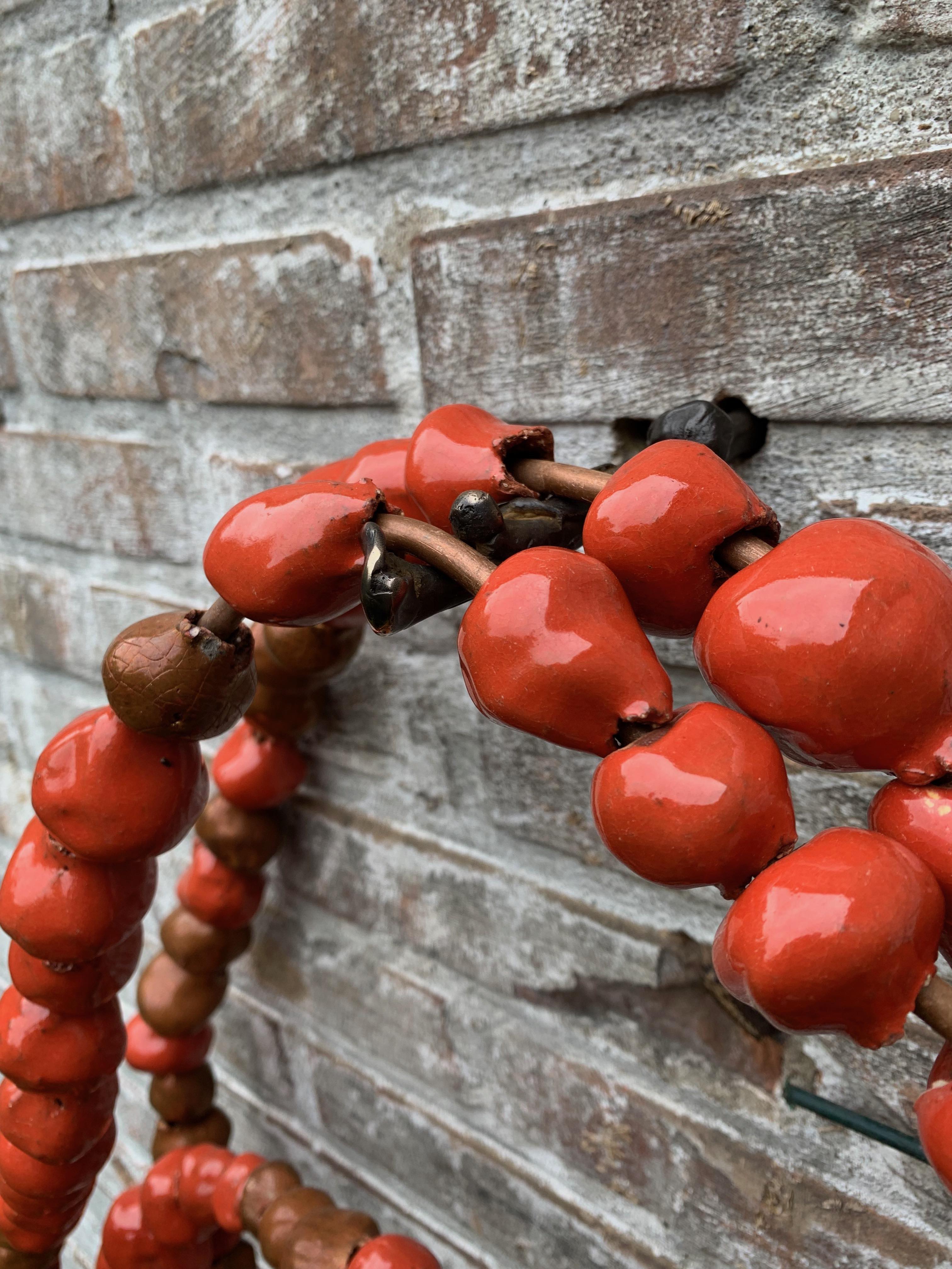geglazuurde aardewerk kralen, koperbuis, bronzen pin