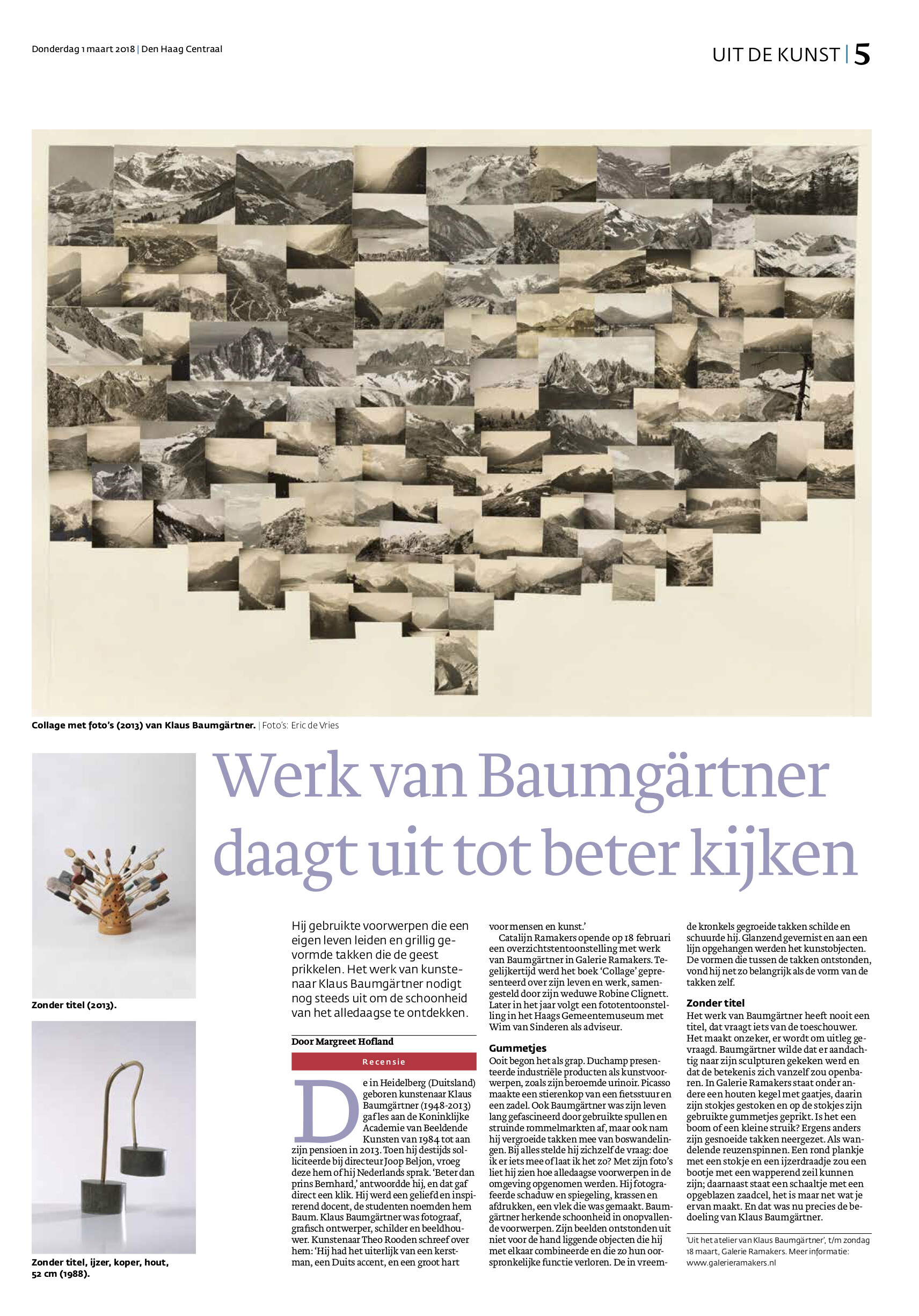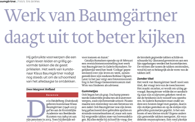 De poëtische kracht van de installaties, objecten en foto’s van Klaus Baumgärtner zit hem niet in de titels (op een enkele uitzondering na is zijn werk ongetiteld) of in het grootse gebaar. De kracht van het tijdloze oeuvre van Baumgärtner schuilt in het verbijzonderen van fragmenten uit zowel de natuur als van gebruiksvoorwerpen tot subtiele installaties. Hij koesterde de kleine, intieme details van takken, stukken hout of metaal. Hij kneedde verschillende fragmenten op nauwgezette en liefdevolle wijze samen tot een poëtisch geheel.