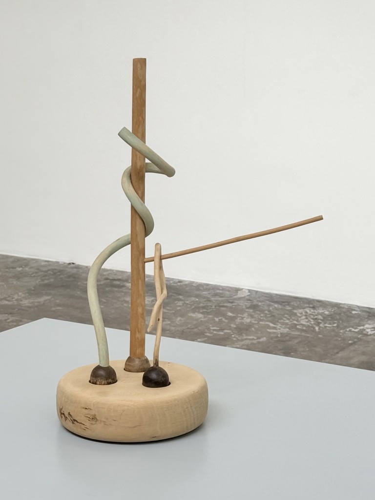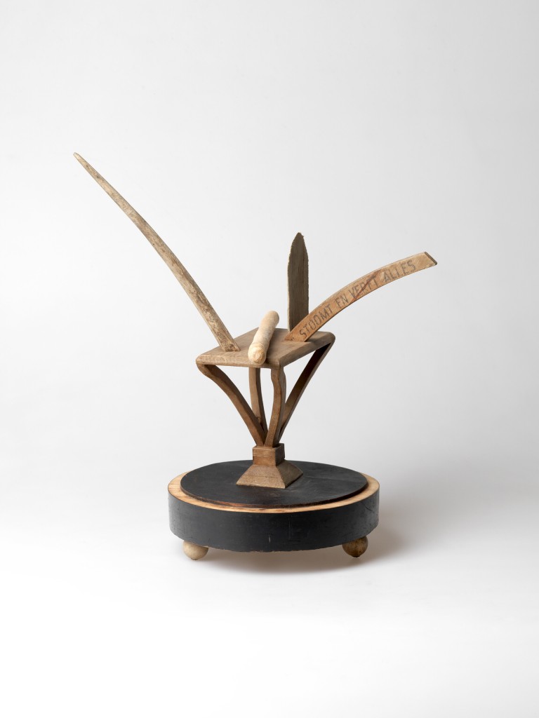 Er was maar weinig nodig om de speeldrift van Klaus aan te wakkeren. Een klerenhanger, een blikje, een oude lepel, nergens kon hij met zijn afblijven, hij wilde de dingen aanraken, bewerken, omvormen. Zijn atelier leek wel een afdeling van gevonden voorwerpen. En tegelijk was het een werkplaats van een ambachtsman. Er stonden machines en er lag prachtig gereedschap waarmee naar hartenlust kon schaven, schuren zagen, fresen, boren en beitelen.Gerrit Willems