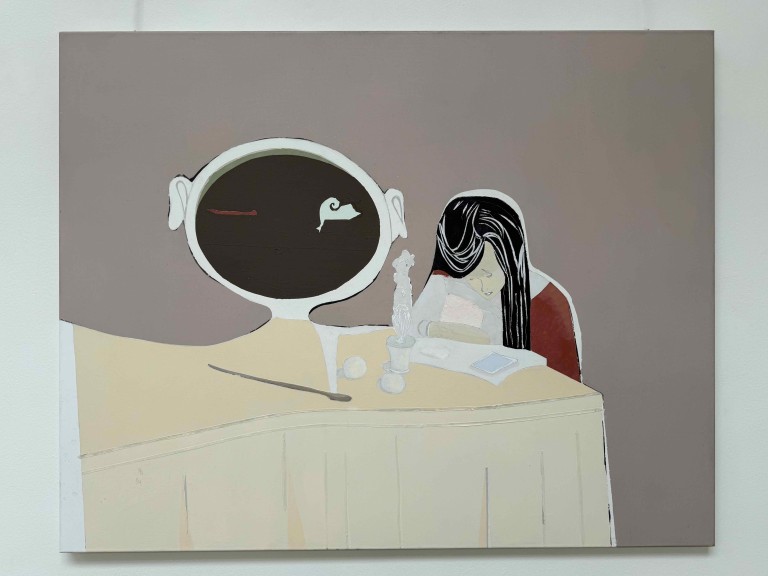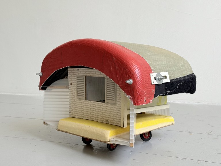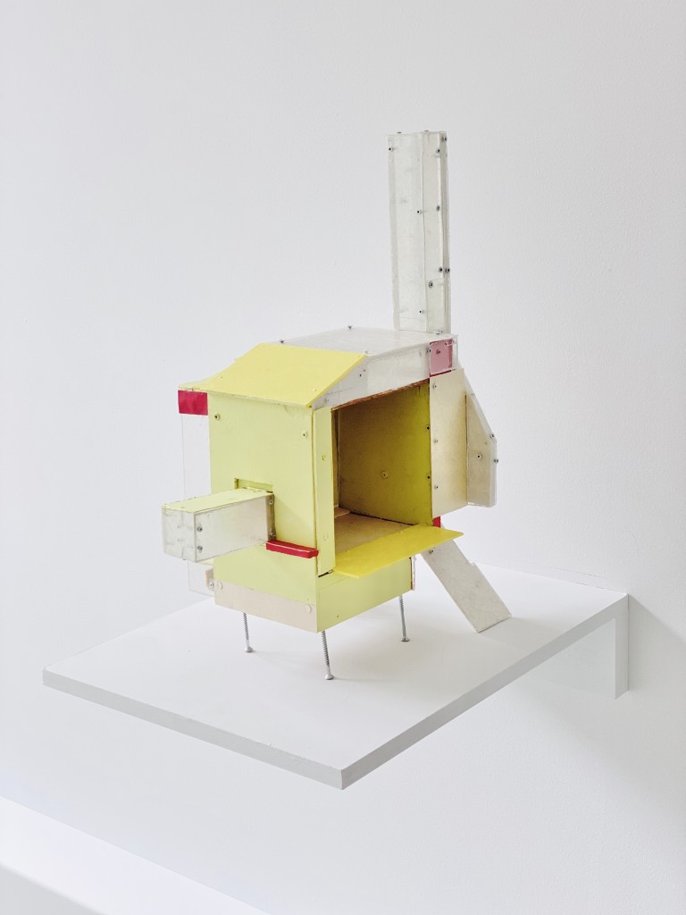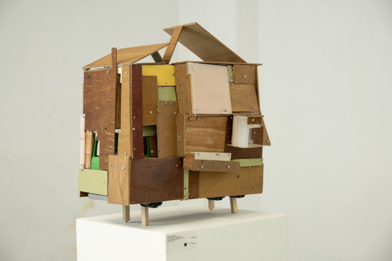 ‘Tijdens het maken van mijn architectonische, je zou kunnen zeggen haast idealistische modellen van huisjes, die men kan uitschuiven en openklappen, was ik op zoek naar het imaginaire uitzicht vanuit deze gebouwtjes. Zo ontstonden mijn schilderijen met landschap en huizen, boten en interieurs, waar men een zekere geschiedenis vermoedt, waar de fijne en minder fijne dingen elkaar treffen en waar, door de manier waarop ze geschilderd zijn, men niet precies weet wat er gebeurt of gebeurd is. Zo kwam ik er achter dat ik met een simpel huisje een transformatie teweeg kon brengen. [Tentoonstelling Huis van de Geest, Gemeentemuseum Den Haag, catalogus Veron Urdarianu]