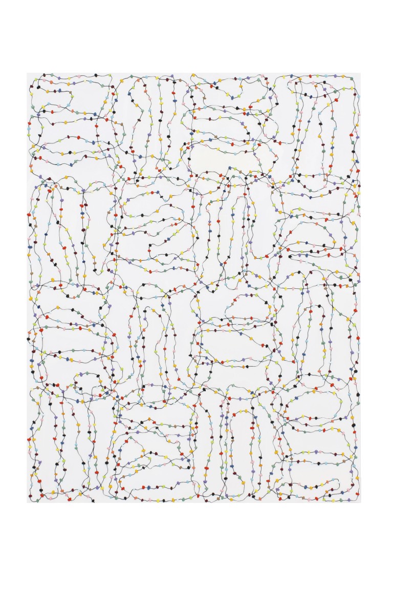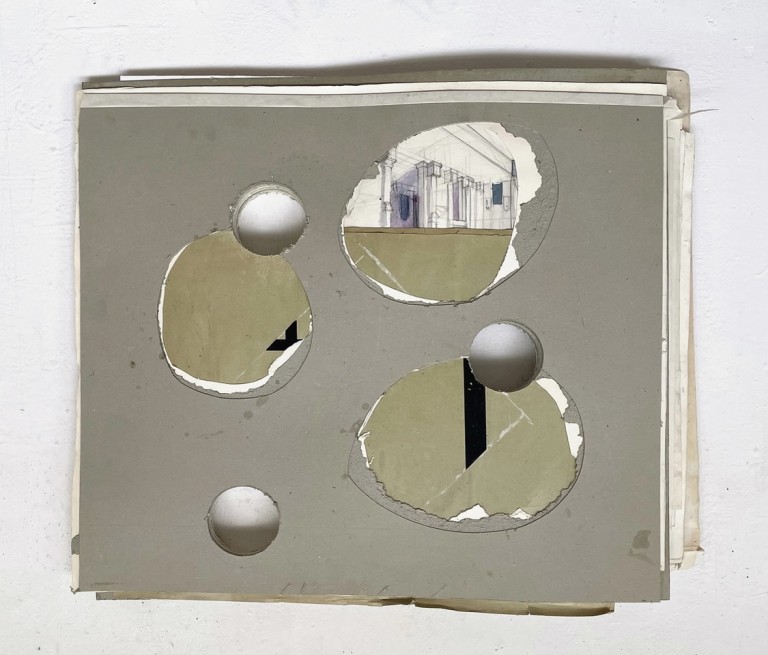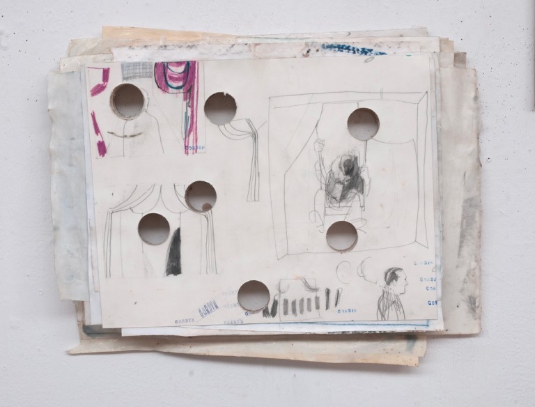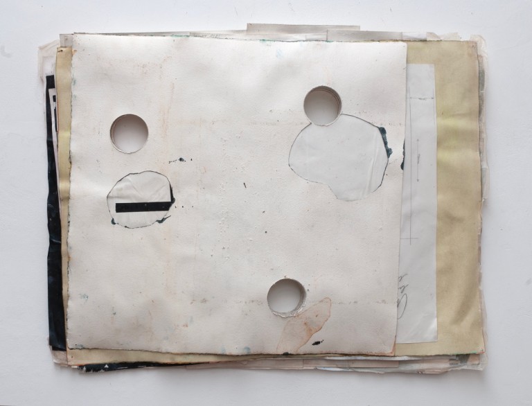 ‘Notities’ noemt ze de kleine werken. In haar atelier hangen er 59 in een rechthoekige formatie boven en naast elkaar. Het is een bron, een voorschot op wat komen gaat. Elk schilderijtje kan de aanleiding zijn voor een nieuwe serie abstracte doeken. Kán. ‘Want als ik er niets in zie, span ik ze af.’