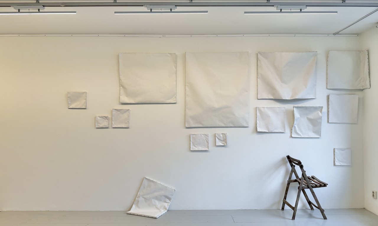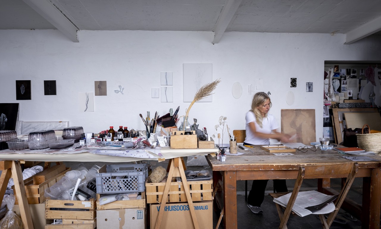Ik herinner me nog precies wanneer ik Judith Kleintjes voor het eerst bezocht in haar atelier hier in Düsseldorf. Eerst door de binnenplaats, dan de trap op, helemaal naar boven, langs haar schilder-collega, en dan: een zee van licht, tussen tere pasteltinten, hier en daar een gouden schittering. Alles is in zijn eigen esthetiek, zelfs de volgorde van de penselen en kleuren is een visueel genoegen. Aan de muur tegenover het raam hangen verschillende werken, op linnen, tekeningen, keramiek. Even lijkt de tijd stil te staan, het eeuwige tikken van de klok pauzeert een nanoseconde. Het is het licht dat hem in de weg staat. Zo direct en duidelijk als het alleen in dit atelier is. En in het noorden van Nederland: het is vluchtig als de horizon die voor je ogen vervaagt tussen de sloten, de weilanden en lucht. Het is het licht en de ruimte die Nederlandse landschapsschilders generaties lang in hun ban heeft gehad, en nu ook ik. Midden in Düsseldorf: een stukje polder.