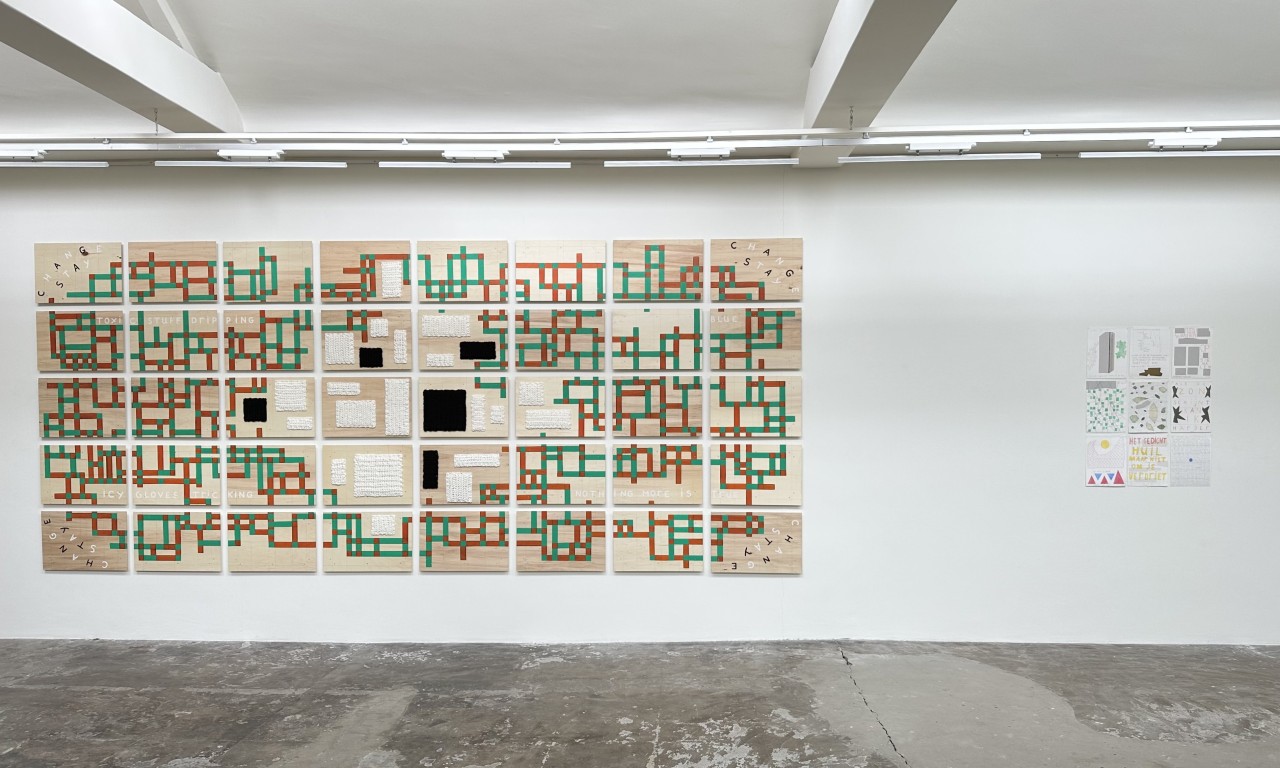 Tekst en beeld lopen als een rode draad door het werk van Mat van der Heijden (1964). Hij combineert herkenbare figuren met geometrische patronen en plakt schijnbaar lukraak zijn letters en woorden op zijn tekeningen en schilderijen. Blijf je wat langer in zijn beeldtaal hangen, dan ontwaar je de eigenzinnige wijze waarop hij de wereld om zich heen in lagen ontrafelt en met zeer uiteenlopende materialen vertaald. Eenmaal uitgedaagd versmelten de lagen, imponeert het niet alledaagse materiaalgebruik en groeit zijn taalgebruik naar poëtische bespiegelingen.